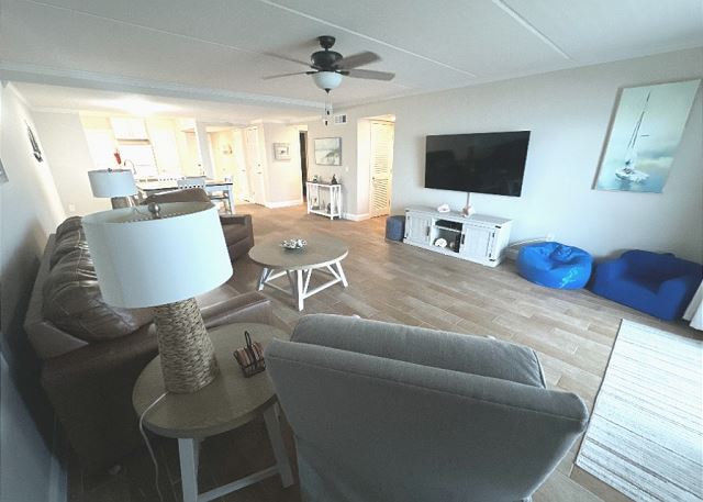 Totally remodeled 2 bedroom, 2 bath oceanfront flat with brand new bedding in all bedrooms!Quartz counters and 16x16 tile in kitchen and baths. Wood grain tile in living/bedroom areas. Expanded master bath with clear glass shower doors. Very well equipped kitchen with expanded pass-through for additional seating and greater ocean view. King, twin bed and twin bunk beds, sofa, three TV's ( flat screen, smart TV's with your password, HI-DEF in living room and master bedroom) stereo.The family room also includes a DVR unit on the TV! high impact windows and sliders and High Speed Internet service. Plantation shutters throughout. At Summerhouse we have 4 temperature regulated pools to choose from on property making it comfortable to swim all year round! There are also four tennis courts, two racquetball courts and one pickleball court. We have two grilling areas and two playgrounds for the kids conveniently located at either end of the property. Our common area around the pools are covered with luscious well-maintained grass with a short walk to the beach. Our rental unit has a friendly front office staff and maintenance on site to help resolve any problem quickly if they should arise. We have a small library and a gym available during normal business hours for your convenience.